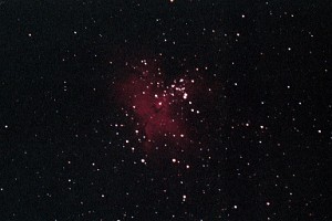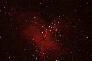 Object: M16 Date: July 22, 2007 Location: "My-Spot" Observatory, West Bloomfield, Michigan (4.2 ZLM) Exposure(s): 12 x 5 Min @ ISO 400 (60 Minutes) Camera: Konica Minolta Maxxum 7D Equipement: 10" f/10 Meade OTA w/GEG and focal reducer at f/7.5 on Losmandy G-11 Guide Scope: ETX90 OTA and SBIG ST-4 Software & Processing: RAW image files were dark frame subtracted and converted to Tif files using my RawHide RAW file converter. The Tifs were then aligned and stacked using Registar 1.0.7 and then processed and cropped using Picture Window Pro.