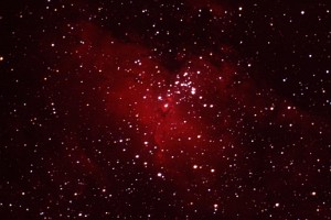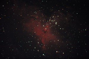 Object: M16 Date: Sept 26, 2000 Exposure(s): 12 Min Film: Kodak PJ400 Equipement: 10" f/10 Meade LX6 Guide Scope: ETX90 OTA and Vixen GA4 Illuminated Guiding Adapter. Hardware & Software: HP S20xi film scanner, Hamrick Software's VueScan, The raw images were color balanced, processed, and cropped, using Picture Window. Info: I was very happy to be able to see the "pillars" in this short exposure.